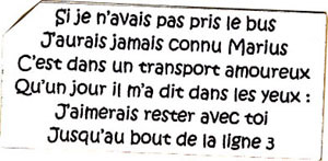 J'aurais jamais connu Marius C'est dans un transport amoureux Qu'un jour il m'a dit dans les yeux J'aimerais rester avec toi Jusqu'au bout de la ligne 3. Katell Autret |